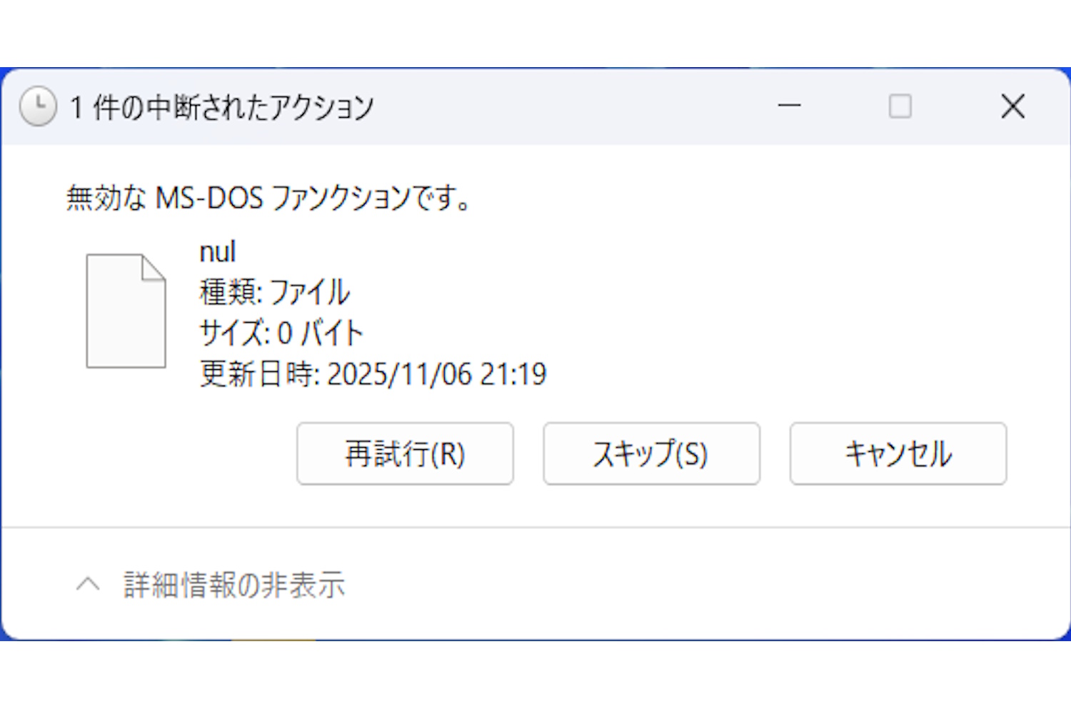 これは、Windowsが「nul」という名前をファイルではなくデバイスとして解釈しようとするために起こる現象です。